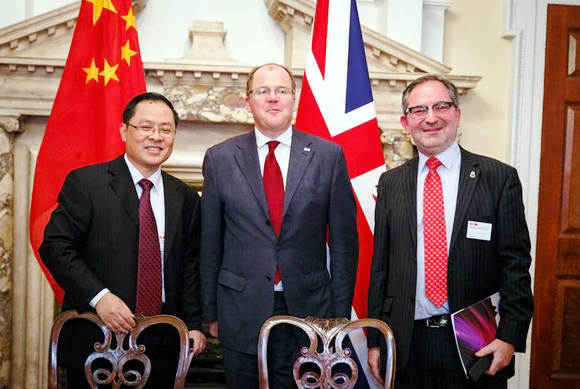 我校肿瘤防治中心副院长钱朝南(左)、英国生命科学大臣乔治-弗里曼(中)、华威大学副校长Lawrence Young(右)合影留念