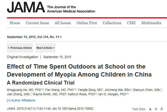 9月15日,我校中山眼科中心何明光教授作为课题负责人、第一和通讯作者,在《美国医学会杂志》(JAMA,IF 35.289)上发表了近视预防文章《Effect of Time Spent Outdoors at School on the Development of Myopia Among Children in China - A Randomized Clinical Trial》(论文链接:http://jama.jamanetwork.com/article.aspx?articleid=2441261),论文以首篇论著的方式发表,同期杂志专门配发了编者按。