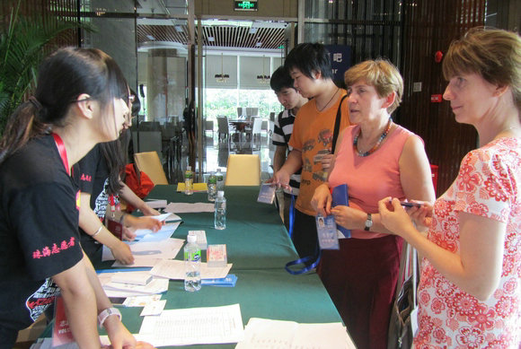 志愿者在服务台耐心地解答问题