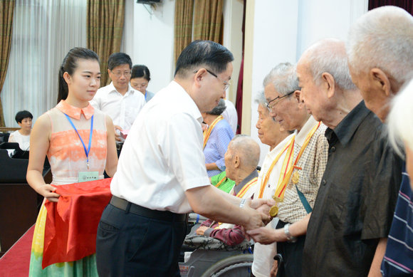 根据党中央、国务院、中央军委要求,9月1日上午,我校在南校区怀士堂举行纪念抗日战争胜利70周年纪念章颁发仪式。我校抗日老战士代表陈化成、戈平、陈逸之、张正吾、李启芬、姚崇仁、滕毅、李哲、张若子等出席。校党委书记郑德涛为他们颁发纪念抗日战争胜利70周年纪念章,副校长魏明海为他们颁发慰问金每人5000元。党办、校办、组织部、宣传部、统战部、校工会、校团委、人事处、离退休工作处、关工委负责人,南北校区党总支委员、离退休党支部书记代表、校关工委、离退休协会、离退休分会以及学生代表共计80余人参加了活动。颁发仪式由魏明海主持。