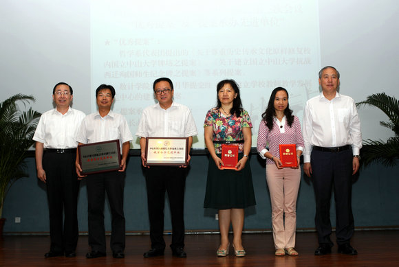 郑德涛书记(左一)、罗俊校长(右一)为荣获八届三次教代会“优秀提案奖”的哲学系教代会代表团(右二)、数计学院程月华代表(右三)和荣获“提案承办先进单位”称号的校长办公室(左三)和校基建处(左二)颁发奖牌和证书