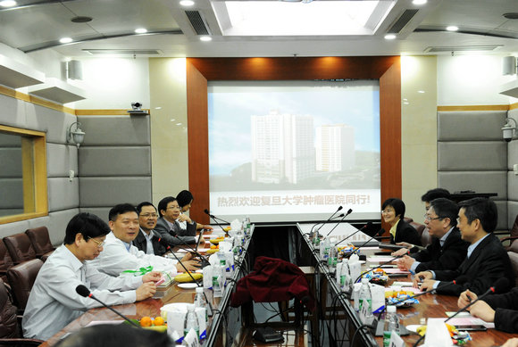 羊年新春伊始,肿瘤医学协同创新中心工作便紧锣密鼓地开展起来了。2月28日上午,肿瘤医学协同创新的重要成员之一——复旦大学肿瘤医院院长郭小毛携复旦大学肿瘤医院全体领导班子成员来到我校肿瘤医学协同创新中心,与院长徐瑞华、书记李建超及协同创新工作小组核心成员进行了深入的探讨交流。