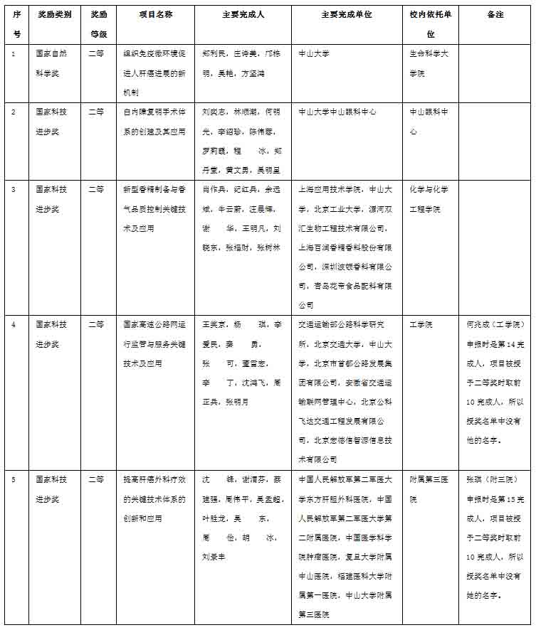 大会表彰了2014年度国家最高科学技术奖、国家自然科学奖、国家技术发明奖、国家科学技术进步奖、中华人民共和国国际科学技术合作奖等国家级科技奖项。我校作为第一完成单位获得2项国家科学技术奖,分别是:生命科学大学院郑利民教授研究团队完成的“组织免疫微环境促进人肝癌进展的新机制”获得了国家自然科学奖二等奖;中山眼科中心刘奕志教授研究团队完成的“白内障复明手术体系的创建及其应用”获得了国家科技进步奖二等奖。此外,我校还作为参加单位获得了3项国家科技进步奖二等奖。与我校长期开展科技合作的美国德州大学M.D.安德森癌症中心获得了中华人民共和国国际科学技术合作奖。据教育部科技发展中心统计,我校获得2014年度国家科学技术奖(通用项目)5项(含参加),全国高校排名第五位。十二五期间,我校共有7项科研成果获国家自然科学奖,居全国高校第三位。