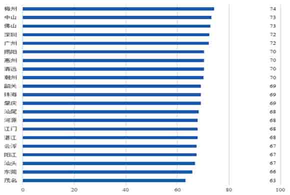 调查结果显示,梅州(74分),中山、佛山(73分),深圳、广州(72分)名列21个省辖市前三。21地市游客满意度指数如下图所示: