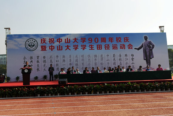22日,学校90周年校庆学生田径运动会在珠海校区举行。校党委常务副书记、副校长陈春声,校长助理、珠海校区管委会主任马骏,珠海市教育局局长钟以俊,珠海市高新区管委会副主任梁兆雄,珠海市文化体育旅游局副局长邬向明,校学生处处长漆小萍,珠海校区党工委书记郝登峰,教育学院党委书记凌春贤、副院长屈琼斐等出席了开幕式。共有来自全校34个院(系)的1326名学生运动员参加此次学生田径运动会。