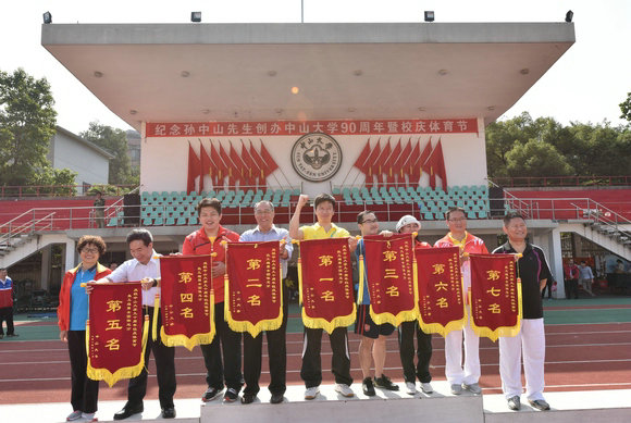 学校90周年校庆体育节教工组男女团体总分前八名登台接受锦旗