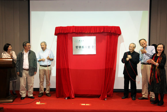 冯达文(右三)、梁庆寅(左二)、陈春声(右二)、李萍(右一)、鞠实儿(左三)共同为“哲学系系史馆”揭牌