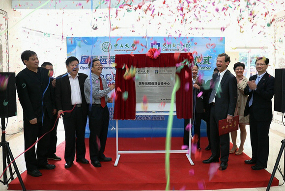 best365中国官方网站常务副校长汪建平、克利夫兰医院的病理系主任Thomas Bauer主任等与会嘉宾为“国际远程病理会诊中心”揭牌