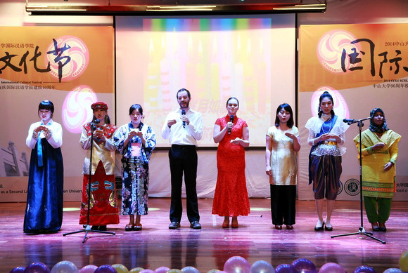 当天,国际汉语学院还举行了品牌特色活动国际文化节,包括“五洲风情游园”和中外校友学生文艺表演。来自英国、法国、芬兰、孟加拉、埃及、墨西哥、韩国、泰国、印度、越南、加蓬、吉尔吉斯斯坦、马达加斯加、秘鲁等十多个国家的上百名留学生和中国学生一道,为中大师生校友们献上多元文化盛宴。“五洲风情游园”一共设置了15个国家的展台,展示各国文化风俗。留学生们让中大师生校友体验到如何在一天之内使用汉语走遍世界。