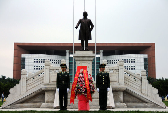 校庆日,校友、师生们向孙中山先生铜像敬献花篮