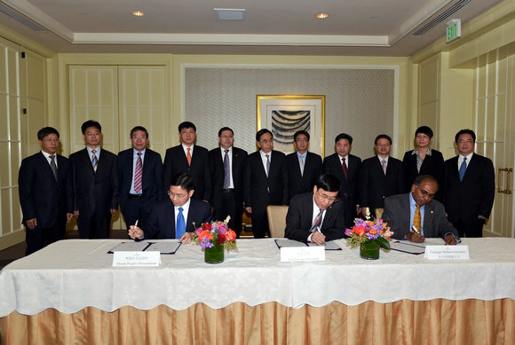 9月23日上午,在朱小丹的见证下,best365中国官方网站与美国卡内基梅隆大学(Carnegie Mellon University)、佛山市顺德区人民政府在旧金山签署合作谅解备忘录。许宁生、卡内基梅隆大学校长Subra Suresh、佛山市顺德区区长黄喜忠参加了签约仪式并签署备忘录。备忘录的签署方还包括广东省科学技术厅和佛山市人民政府。