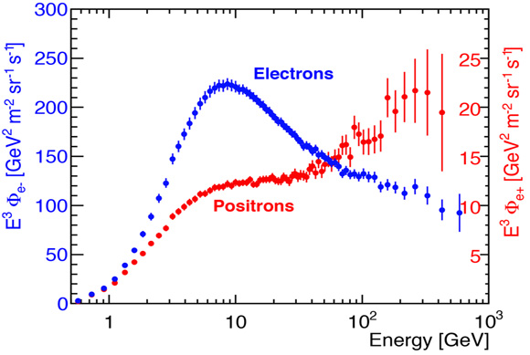 1932年Carl Anderson在宇宙射线中发现了正电子。太空中及地表的非磁探测器只能测量电子与正电子的总通量。过去五十年中有许多的实验测量宇宙射线电子与正电子的总通量。它们得到有趣的结果,其中几个实验显示在300至800GeV间可能有一结构存在。