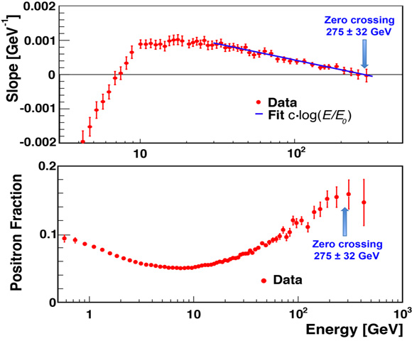 AMS已分析了四百一十亿件初级宇宙射线之事例,其中一千零九十万件经辨认为电子与正电子。AMS测量了能量在5亿至5千亿电子伏特之间的“正电子分率”(即正电子数占电子与正电子总数之比例)。我们发现此分率在80亿电子伏特时开始快速增加(如图一),显示有新的正电子源存在。图二表示正电子分率随能量增加而增加之速率已被精确测出,并无明显之尖峰存在。正电子分率停止增加的能量(即分率达最大值时的转折点之能量)经测得为275±32 GeV(1GeV为十亿电子伏特),如图二之上图所示。此乃半世纪来的宇宙射线实验首次看到正电子分率的最大值。多出的正电子分率在百分之三的误差范围内是各向同性的,强烈显示高能量的正电子可能不是来自某些特定的方向。