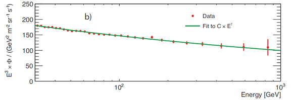 AMS是一粒子物理探测器,能对电子、正电子以及电子与正电子总和进行许多独立的测量。在搜集四百一十亿宇宙射线的事例后,AMS测量了电子与正电子的总通量如图四上图所示。总通量是平滑的并揭示了明显的新信息。最有趣的是在高能量且在很宽的能量范围内,总通量可以由单一不变的谱指数描述(见图四下图)。