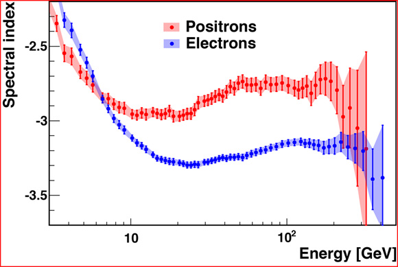通量随能量的变化由“谱指数”来定,通常是正比于能量的谱指数次方。AMS的结果显示电子通量与正电子通量均无法由单一不变的谱指数描述,见图三下图。特别是在20到200GeV之间,正电子通量随能量变化的速率竟高于电子通量。这是“正电子分率多出乃源于高能正电子的相对多出(例如由暗物质碰撞所致)而非高能电子损失”的重要证明。这些结果也在Physical Review Letters的另一篇论文发表。