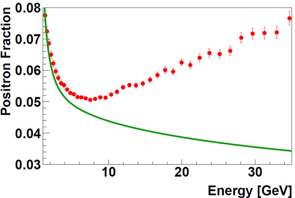 图一 AMS测量的正电子分率(红圈)与由平常宇宙射线碰撞的预测(绿线)比较显示在80亿电子伏特(8GeV)以上正电子分率开始快速增加。此增加指出新正电子源的存在。