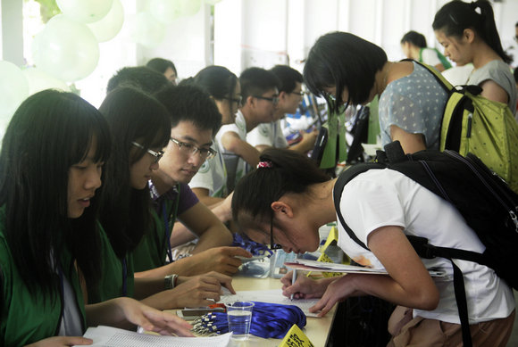 迎新点,志愿者做报到指引
