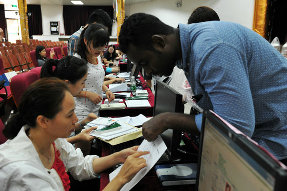 外国留学生新生在迎新点报到