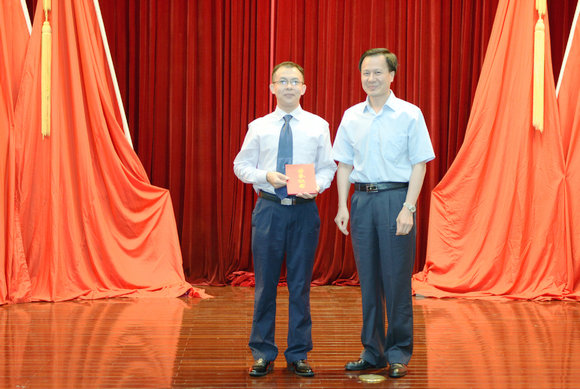 肖海鹏书记(右)为一等奖获得者刘早华(左)颁发荣誉证书