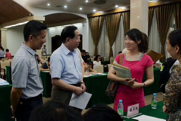 郑德涛书记与现场报到的新教职员交谈