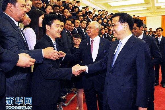 5月31日,中国与马来西亚建交40周年庆祝大会在北京人民大会堂举行。大会前,国务院总理李克强和马来西亚总理纳吉布共同会见中马两国青年代表。我校社会学与人类学学院2010级社会学学生、全国学联执行主席、校学生会原主席江皇甫同学代表全国学联,受到国务院总理李克强和马来西亚总理纳吉布会见。在会见中,李克强总理勉励两国青年人做中马友好的推动者和践行者,将两国传统友好传承下去,不断发扬光大。