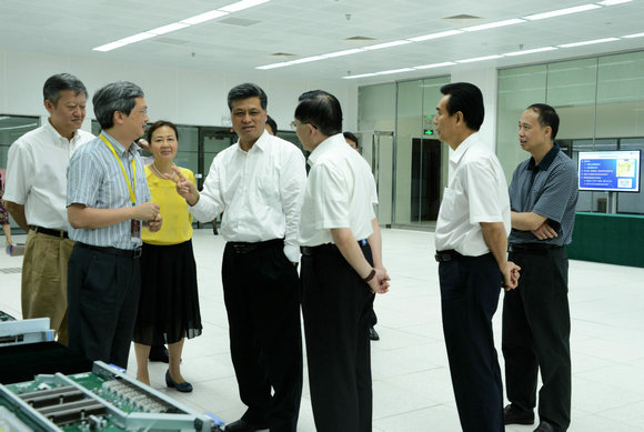 马兴瑞副书记一行还来到国家超级计算广州中心,参观我校90周年校庆创新成果展,考察了“天河二号”的运行情况及应用前景。超算中心常务副主任卢泽新向马兴瑞副书记介绍了“天河二号”的相关情况。
