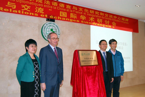 外国语学院院长常晨光教授,法国驻广州总领事白屿淞先生,中心荣誉主任、里昂大学副校长皮埃尔·萨尔维特教授,中心主任蒲志鸿教授先后致开幕辞,并共同为中心揭牌。研讨会由大会发言与圆桌会议组成。里尔政治学院外事处处长Patrick Mardellat教授、华南师范大学历史系主任张庆海教授、皮埃尔·萨尔维特教授分别作主题发言。圆桌会议阶段,我校历史系周立红副教授、华南师范大学历史系周小兰副教授、黎英亮老师以“中国人心目中的法国形象”为主题,我校中法核工程与技术学院Sophie Lorrain老师、广东外语外贸大学谢咏教授、蒲志鸿教授以“中法礼仪互视:和谐与争论”为主题,进行了热烈深入的发言与讨论。