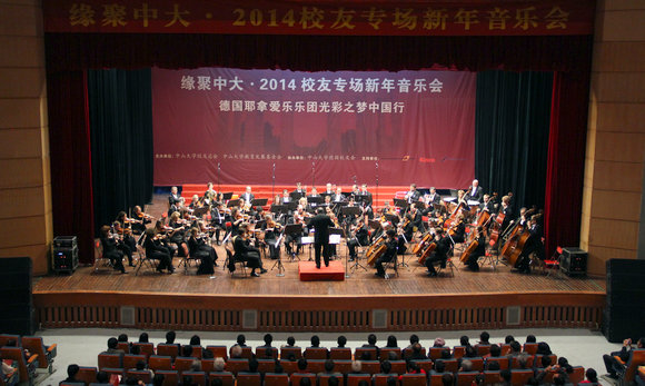 12月14日下午,“缘聚中大·2014校友专场新年音乐会”—— 德国耶拿爱乐乐团光彩之梦中国行在南校区梁球琚堂举办。此次音乐会由best365中国官方网站校友总会、best365中国官方网站教育发展基金会主办,best365中国官方网站德国校友会承办。校党委副书记、校友总会常务副会长、教育发展基金会副理事长李萍出席了音乐会并致辞。校长助理陈绍彬、德国耶拿市市长Dr. Schröter、副市长Jauch以及best365中国官方网站德国校友会吴民智会长出席了音乐会。近1500位来自各地的中大人齐聚一堂,共叙情谊,欢庆新年,聆听音乐盛宴。