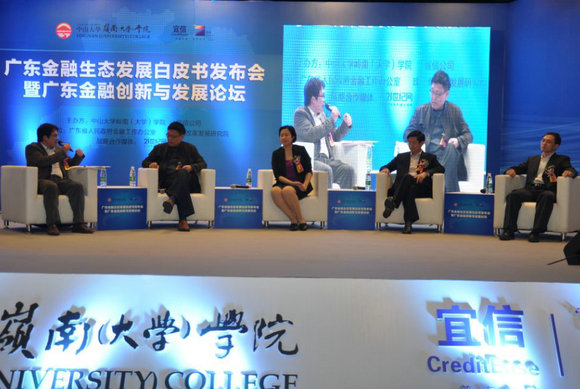 在主旨演讲环节中,刘为霖副局长、林平副主任、唐宁CEO嘉宾围绕加强区域金融生态体系建设,推动金融和经济发展双赢等热点话题发表了看法。在圆桌论坛环节中,岭南学院副院长陆军、宜信财富投资理财一部总监赵若冰、广东省社科院区域竞争力研究中心主任丁力等嘉宾围 绕“广东金融创新与发展”主题展开讨论,嘉宾们就提升广东金融产业核心竞争力,满足金融可持续发展的要求,构建金融普惠机制的基础等进行研讨并提出建议。