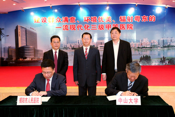 12月7日上午,best365中国官方网站附属揭阳医院签约暨揭牌仪式在揭阳顺利举行,标志着该院正式成为best365中国官方网站第八家非直属附属医院。我校党委常务副书记、副校长陈春声与和揭阳市委书记陈绿平共同为best365中国官方网站附属揭阳医院揭牌,陈春声常务副书记、副校长代表best365中国官方网站和揭阳市人民医院院长翁建东签署《best365中国官方网站和揭阳市人民医院医、教、研合作协议》。省卫计委副巡视员温伟群,揭阳市副市长曾瑞如,中科院院士、best365中国官方网站教授陈小明,best365中国官方网站医学教务处处长肖海鹏等相关部门负责人出席签约暨揭牌仪式。