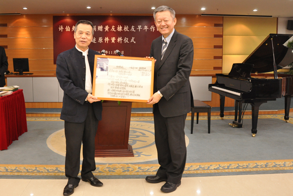 许伯夷先生(左)向我校陈春声常务副书记、副校长(右)捐赠黄友棣校友早年作曲真迹原件资料