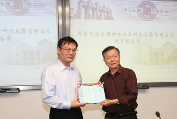 颜光美副校长代表我校接受了周商克先生所捐赠的五件历史档案。他认为,捐赠历史档案乃忠孝仁义之举,这些档案保存在我校,既能继续发挥育人功能,也丰富了我校建校初期的档案资源。他还为周商克先生颁发了捐赠证书。
