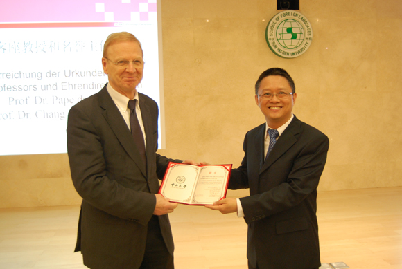 仪式结束后,Walter Pape教授作了题为“谁对历史仅只是期待着光明和知识,谁就会非常的失望”;Karl-Heinz G.ttert教授作了题为“全球化视野中的德语:发展和前景”的学术报告。
