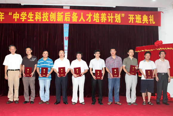 开班典礼举行了导师聘任仪式、学生拜师仪式和“广东省中学生英才计划培养基地”揭牌仪式。我校姚正安教授等8位教师被聘任为“中学生英才计划特聘导师”,省科协党组何真书记和我校党委陈春声常务副书记、副校长向导师们颁发了聘书。华南师范大学附属中学李融尚等38名优秀高中学生入选参加首批中学生英才计划试点工作,向导师们鞠躬行拜师礼。同时,“广东省中学生英才计划培养基地”成立并揭牌,我校将承担培养广东省优秀中学生科技创新后备人才的任务。