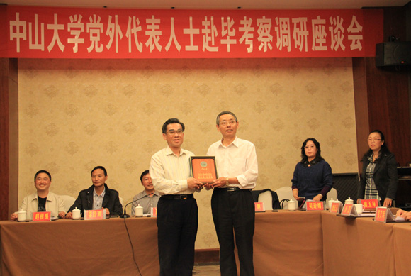 我校党委统战部部长郭小聪(左)向毕节市委统战部常务副部长杨旭(右)赠送纪念牌匾