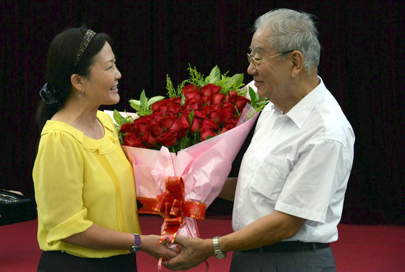 李萍副书记代表校党委对李宝健教授从教58年表示敬意和感谢。李萍副书记感叹道,李宝健教授对祖国的忠诚令她感受甚为深刻,其爱才如子的襟怀也让她甚为感激。致辞过程中,李萍副书记为李宝健教授送上鲜花以示与中大的五十余年情缘。