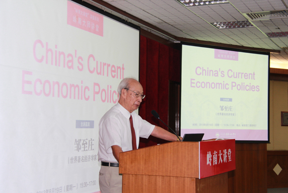 8月19日下午,世界著名经济学家、普林斯顿大学教授、岭南学院董事会名誉主席邹至庄先生做客岭南大师讲堂,为岭南学院师生做了题为“China's Current Economic Policies”的全英文讲座。岭南学院徐信忠院长,张艳梅、王曦副院长,余立人副书记以及学院各专业的本科生、硕士生等一共300余人参加了本次讲座。
