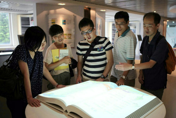 随后,栗原教授一行参观了基地的“全球汉语教材展示中心”。基地收藏了老舍先生为英国灵格风语言中心编写的、世界上最早的一套汉语教材和声片《言语声片》,教材由老舍先生亲自用毛笔书写,声片亦由其录制。该套教材引起了栗原教授一行的极大兴趣,他表示,曾在老舍纪念馆看到过这套教材,但没能听到配套录音,这次十分有幸在best365中国官方网站听到了老舍先生很有特色的发音。在试听“汉语教学有声挂图”、体验“翻书机”后,栗原教授赞叹道,多媒体技术日新月异,将其运用于汉语课堂教学中,十分有趣、有效。