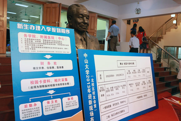 学生处今年修改了《入学指引》,新的《入学指引》包含“公益囊”和“‘悦’读感”两项内容。“公益囊”要求新生暑假参加公益活动,“‘悦’读感”则指阅读《弟子规》的感想,旨在培养学生实践公益、回归经典的意识,使他们学会立身做人。今年的《入学指引》还添加了“人心向学”、学生思想教育“三项工程”的介绍,以及大学生年度人物典型事迹的展示。这使《入学指南》更富人文气息,于细微处体现中大风格。同时,学生处还于暑期设立资助热线,开展资助服务,为学生、家长解答疑惑;及时发布《2013级家庭经济困难新生资助工作安排》(学生﹝2013﹞157号),将新生资助服务工作进行系列部署,包括迎新绿色通道、家庭经济困难新生认定、家庭经济困难新生数据库、新生助学金项目申请以及校园地、生源地国家助学贷款手续的完成等。截至8月15日,学生处缓交学费绿色通道已接待了298位家庭经济困难学生,解决了他们的燃眉之急。