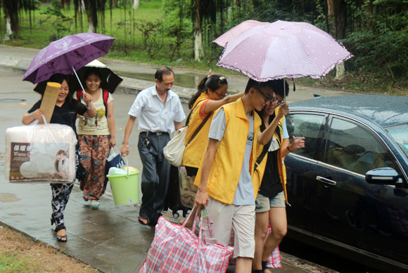 为尽量减轻台风对迎新工作的影响,研究生院商同各有关单位,在迎新现场增设遮雨棚,并准备大量雨伞和塑料袋,为新生和家长遮雨或放伞使用;提醒各有关机关及研究生培养单位在布置有关工作时充分考虑台风的影响因素,切实做好各项服务工作;同时与保卫处专门研究现场车辆和人群的疏导问题,最大程度上为新生和家长提供便利的同时,确保现场的安全和秩序。