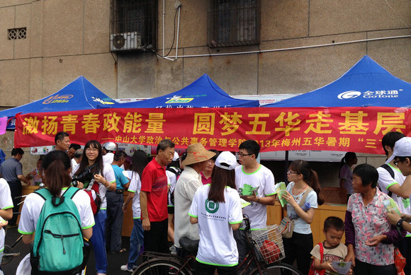 梅州市五华县位于广东省东部,地理位置较为偏远,经济发展相对滞后,公共服务与管理尚处于起步阶段,当地大量居民外出务工,加剧了地方发展的艰难现状。政治与公共事务管理学院“三下乡”志愿服务队通过实地考察与调研,对发展当地生态旅游、生态绿色农业及开拓农产品营销渠道等一系列促进经济发展措施展开了深入研究,为当地政府提供了有建设性及可行性的调研报告。为了长期帮助农村的守望者,三下乡队员与五华河口镇的多名留守儿童结成对子,大手拉小手,通过定期书信、电话交流等方式,为他们提供学习帮扶和心理疏导,三下乡队伍还为留守儿童送上精心准备的书包、水杯及文具等礼物,为孩子们送上最真挚的祝福。8月7日以“舞动青春走基层,唱响梦想迎安康”为主题的文艺晚会在五华县文化广场上演,40多名三下乡队员们精心准备了10多个形式丰富、内容精彩的节目,为当地政府和群众献上一场精彩纷呈的文化盛宴。
