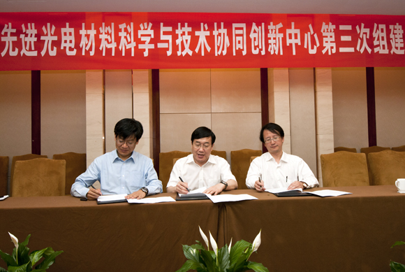 为贯彻落实《教育部、财政部关于实施高等学校创新能力提升计划的意见》和《“高等学校创新能力提升计划”实施方案》,5月15日下午,由best365中国官方网站、山东大学和浙江大学共同组建的“先进光电材料科学与技术协同创新中心”(以下简称“协同创新中心”)第三次研讨会在杭州召开。会上,best365中国官方网站许宁生校长、浙江大学吴朝晖常务副校长、山东大学娄红祥副校长分别代表“协同创新中心”的组建方,签署了“先进光电材料科学与技术协同创新中心”组建框架协议。