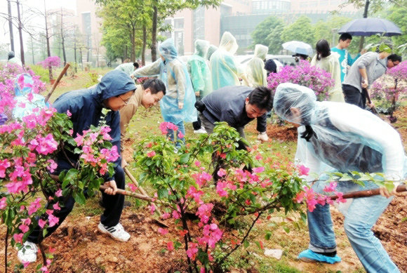 师生们互帮互助、团结协作,不怕脏、不怕累,干劲十足,共同翻动着这雨中的春意。在现场,几个可爱的小朋友也来助阵,他们都是院里老师的子女,不停挥动着手中的小铁锹,来回穿梭,脸上洋溢着纯真的笑容,为植树活动平添了不少乐趣。在师生们的努力下,现场百余棵花木已全部培植完毕。但师生们意犹未尽,在刚植下的花木间留了几张温馨有爱的合影,这才不舍地放下铁锹。
