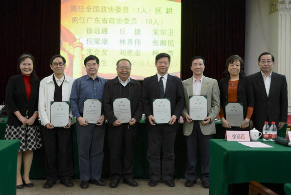 郑德涛书记在总结时强调,各单位要认真学习领会“两会”精神,抓好会议精神的贯彻落实,结合学校十二五规划及各项工作,推进学校的科学发展;期盼各级人大代表、政协委员们积极为党和国家建言谋策,为扩大学校影响力、提高学校声誉发挥作用。郑书记还为离任的全国、省政协委员颁发鸣谢证书,感谢他们在担任政协委员期间,认真履行职责,积极参政议政,为国家、广东省和我校的发展作出了贡献。