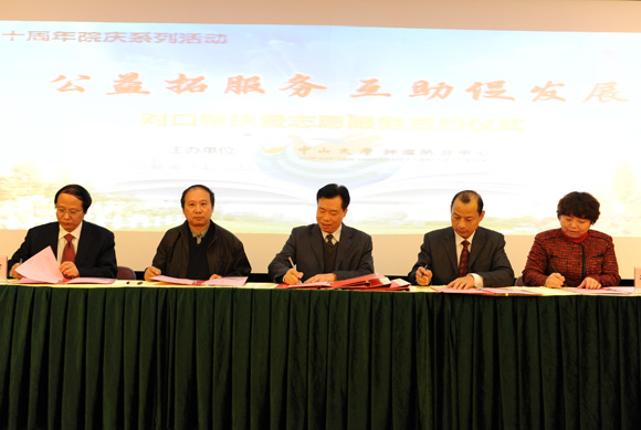 近日,我校肿瘤防治中心与五省八家医院签订了新一轮的对口帮扶协议,并与广州市十大高校签订了志愿服务项目。广东省卫生厅副厅长陈祝生、我校副校长黎孟枫、对口帮扶医院代表及中心社会监督员等嘉宾出席了活动,中心党委书记李建超主持仪式。