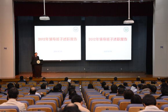 12月30日下午,全校2012年度考核述职测评大会在南校区举行。会议由郑德涛书记主持,全体校领导、部分单位负责人在会上作年度述职报告。现任校领导、老领导、两委委员、职能部门和二级单位主要负责人、专任教师代表、民主党派和无党派人士代表、教代会代表、离退休老同志代表、学生代表等200余名师生参加了述职测评大会。