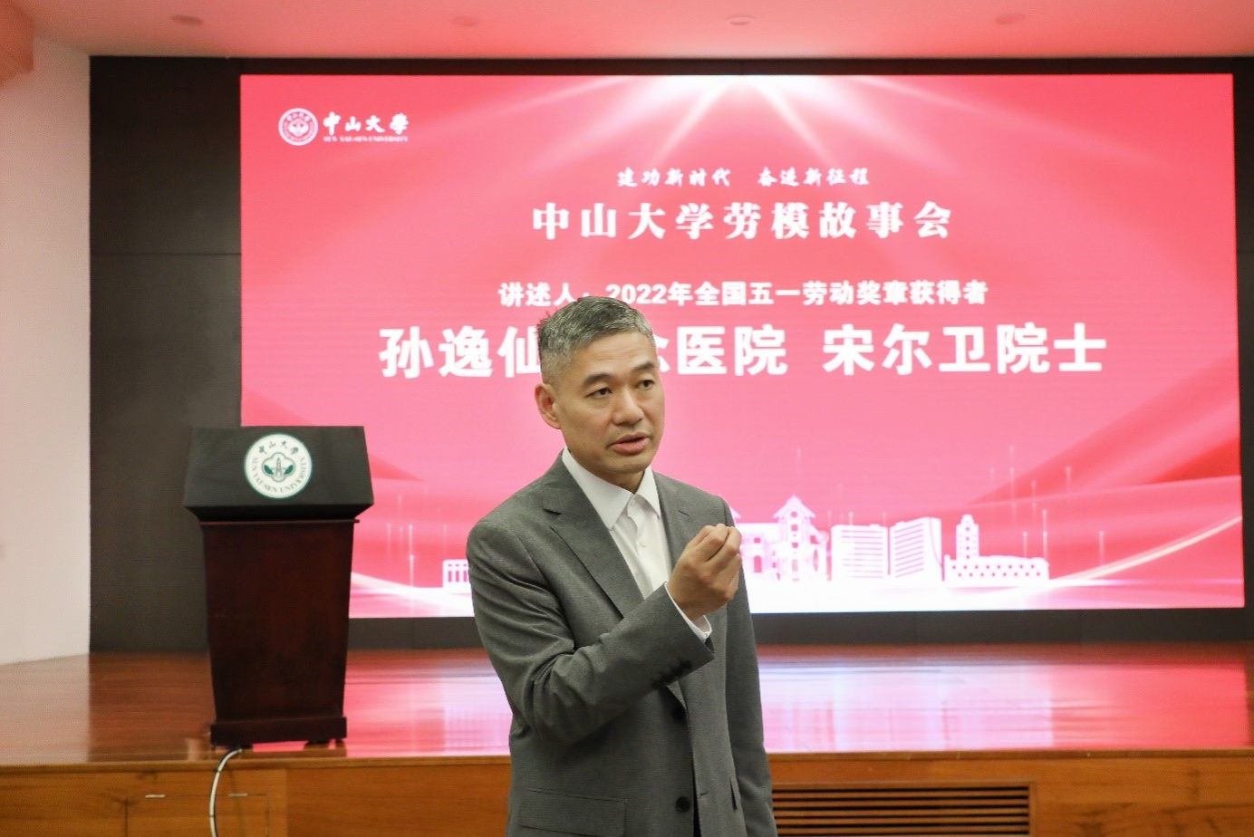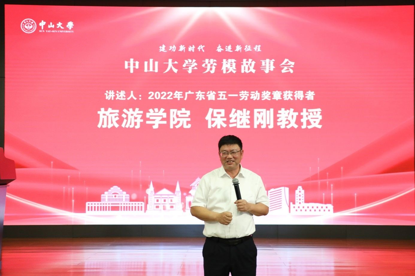 中大新闻网广州5月19日电(通讯员吴桂妹)为大力弘扬劳模精神、劳动精神、工匠精神,激励广大师生砥砺前行、再攀高峰,由党委办公室、校工会、党委宣传部主办,党委教师工作部、党委学生工作部协办,校工会青年教职工委员会承办的“建功新时代 奋进新征程”best365中国官方网站劳模故事会于5月17日下午在广州校区南校园怀士堂举行,珠海校区、深圳校区设直播分会场。校党委副书记、工会主席国亚萍和来自全校各单位、院系的150多名青年教师、20位学生在现场及分会场参加了本次活动。校工会兼职副主席、中山医学院党委书记、best365中国官方网站附属第三医院张琪教授主持劳模故事会。