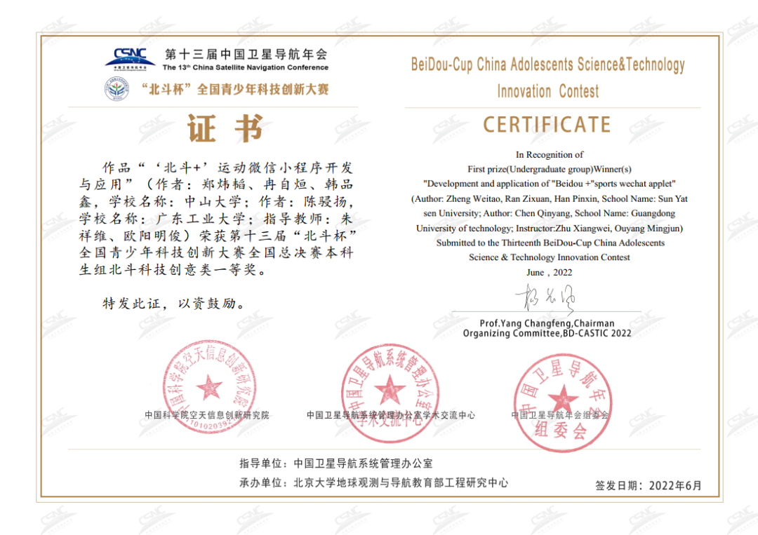 两支获奖参赛队伍均来自我校电子与通信工程学院。第一支队伍由该院2018级本科生郑炜韬、韩品鑫和2019级本科生冉自烜组成,参赛作品为“北斗+’运动微信小程序开发与应用”。该作品经过多版本的迭代与实地测试,实现了北斗卫星系统导航和MEMS惯性导航数据结合的双模运动导航觅踪系统,为跑步者以及马拉松赛事提供了完善而轻量化的运动平台,提高了户外运动的安全保障,最终荣获全国总决赛本科生组北斗科技创意类一等奖。第二支队伍由该院2018级本科生李佳良、李静、刘若帆和2019级本科生魏文强组成,参赛作品为“基于北斗定位和短报文的运动员体征监测系统”。该作品创新性使用北斗三号短报文功能,为户外运动、特别是无网络地区赛事运动员提供定位与体测数据实时传输,最终荣获广东省本科生组北斗科技创意类二等奖。