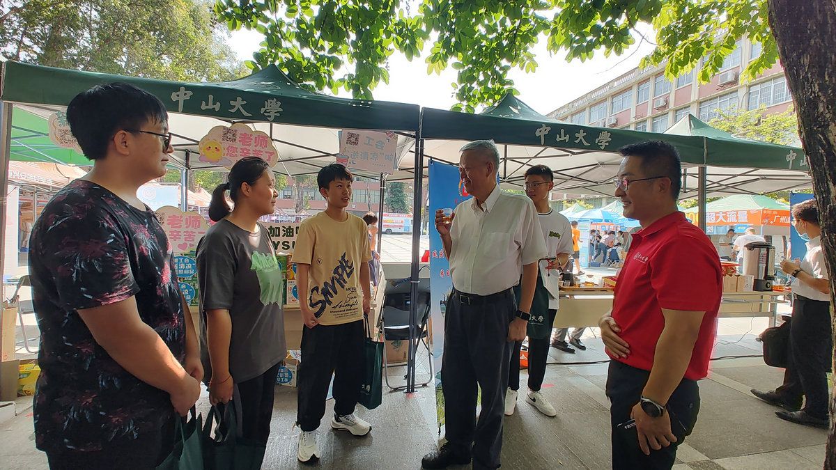 校工会兼职副主席、中山医学院党委书记张琪教授(左三),校工会委员李秀红教授(右三)“送清凉”慰问北校园迎新一线工作人员(来源:校工会)