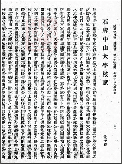 1934年,石牌校区首期工程完工,中大师生兴高采烈,朱子范的《石牌best365中国官方网站校赋》表达了众人的喜悦心情,同时描述了石牌中大的创办过程及其地理形势、建制规模、华丽建筑、典藏仪器和新式教学。赋中的“左则文教兴蔚”、“右则刑名肄习”、“负以农科之馆第,带以理工之崇垣”,讲的是刚建成的中大文学院(今华工5号楼)、法学院(今华工12号楼)、农学院农学馆(今华农3号楼)、工学院机械电气工程教室(今华工6号楼)等建筑;学校的昭阳、洪泽、鄱阳、洞庭湖上美景,令“翩白鹭之欲下,惊海鸥之飞鸣”;图书馆是“玉轴金箱,紫文石室”,博物馆有各种飞禽走兽标本;学校实验室内有测量“声光电化,液热气力”的仪器,科研人员可以“可坐视其变化,若指掌之历历。”最后的“孙公起焉,邹公止焉”,指的是孙中山先生倡导、邹鲁校长主持操办中大新校建筑,“雄踞石牌,耀四海焉”,即中大石牌校区的建成在海内外享有声誉。赋作为一种古老的文体,源于楚辞,以汉赋最为闻名。以后唐诗、宋词、元曲及明清小说各领风骚,赋则逐渐式微,“五四”以后,作赋者越来越少。此时的朱子范虽才30岁出头,他枕藉经史,诗文大雅,撰成此赋,显示了“负不羁才,有湖海气”(黎闻非语)的性格。为此,江孔殷说:“余喜子范之博洽多能,尤喜旧学继续之有人也。”